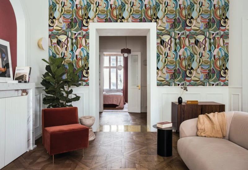 Prachtig eclectisch vliesbehang van Hooked on Walls. Alle warme kleuren en mooi organische vormen bij elkaar. In deze collectie vind u ook bijpassende uni's met een linnen look.